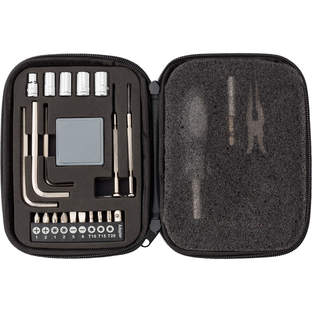 Entdecken Sie das vielseitige Werkzeugset „Uppsala“ – Ihr unverzichtbarer Begleiter für alle Heimwerkerprojekte. Dieses kompakte Set enthält 24 hochwertige Werkzeuge, darunter 5 Steckschlüssel, 3 Sechskantschraubendreher, 9 Schraubendreherbits, 1 Stecknuss, 1 Maßband, 2 Präzisionsschraubendreher, 1 Schraubendrehergriff, 1 Verlängerungsstange und 1 Zange. Alles sicher verstaut in einem eleganten, schwarzen Reißverschluss-Etui aus robusten Materialien wie ABS, EVA, Metall, Polyester, PU und TPR. Mit einer handlichen Größe von 17 x 12,5 x 3,5 cm ist es ideal für unterwegs. Perfekt für den ambitionierten Heimwerker, der Qualität und Funktionalität schätzt. Herkunftsland: China.